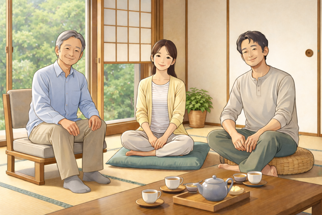 坐り方は、胡坐・正座・椅子など、自由に選択していただけます。